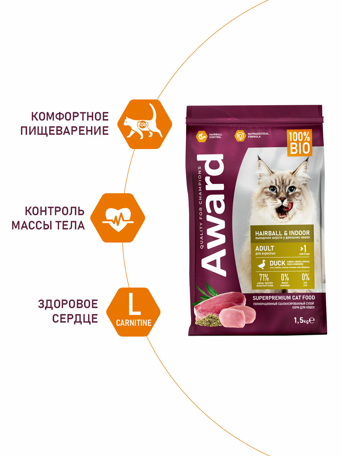 Сухой корм AWARD Hairball & Indoor для взрослых кошек для выведения шерсти с уткой и индейкой с добавлением зеленой чечевицы и Юкки Шидигера 1,5кг