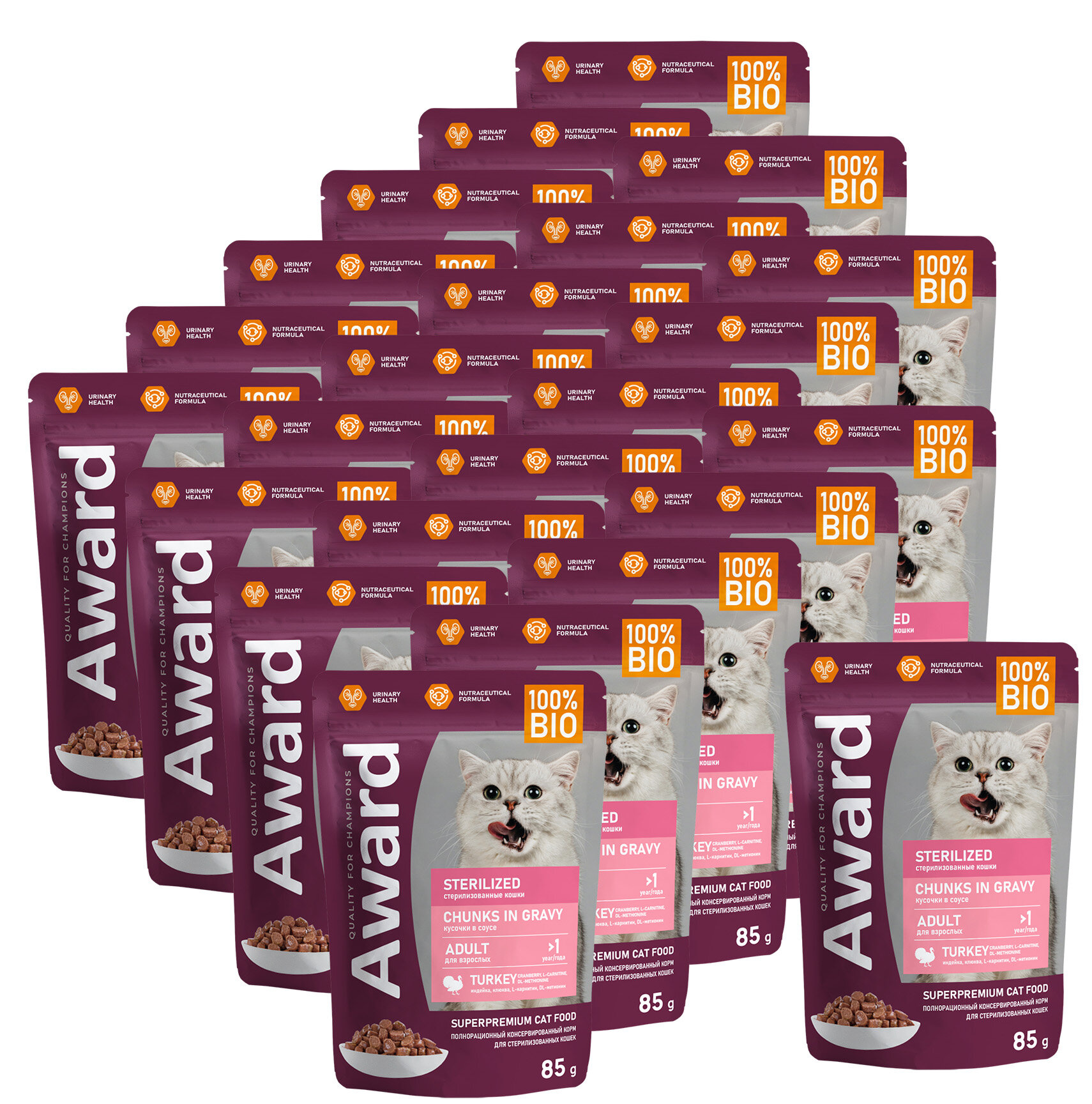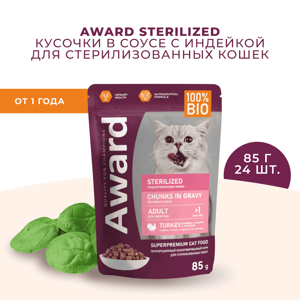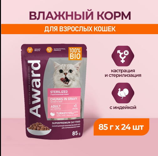 Купить AWARD Sterilized влажный корм для взрослых стерилизованных кошек, кусочки в соусе с индейкой, в паучах - 85 г х 24 шт