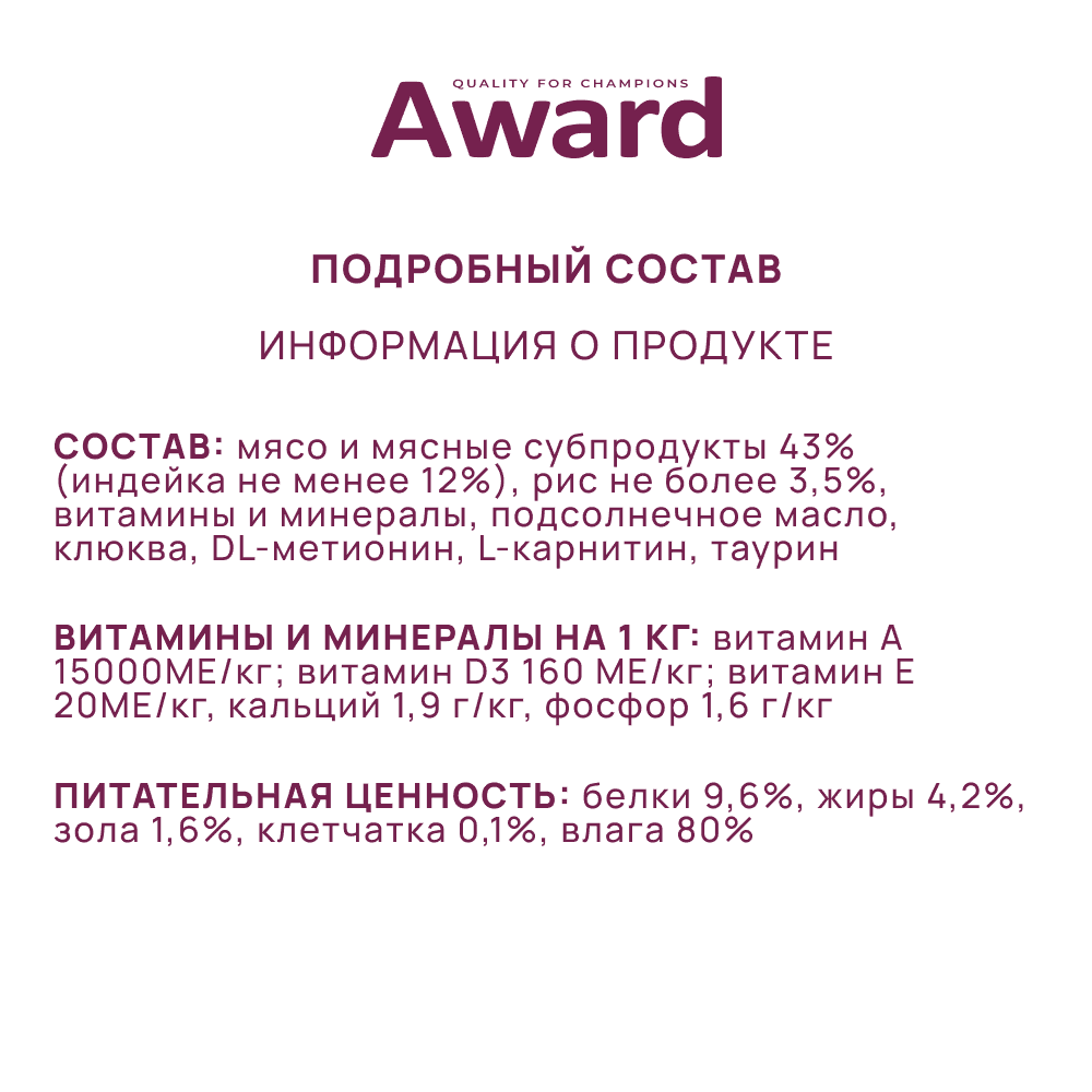 AWARD Adult Корм влаж. паштет из индейки с овощами д/кошек конс.100г