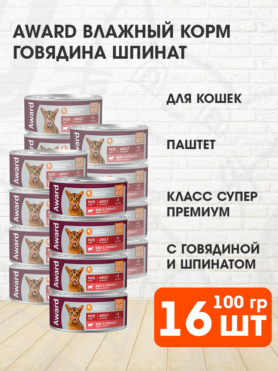 Купить AWARD влажный корм для взрослых кошек, паштет из говядины со шпинатом, в консервах - 100 г х 16 шт