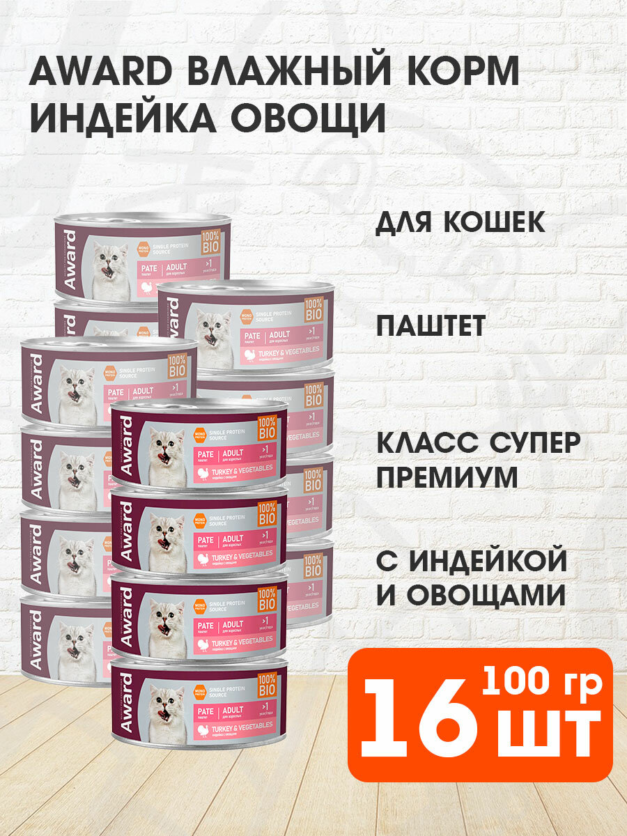 Купить AWARD влажный корм для взрослых кошек, паштет из индейки с овощами, в консервах - 100 г х 16 шт