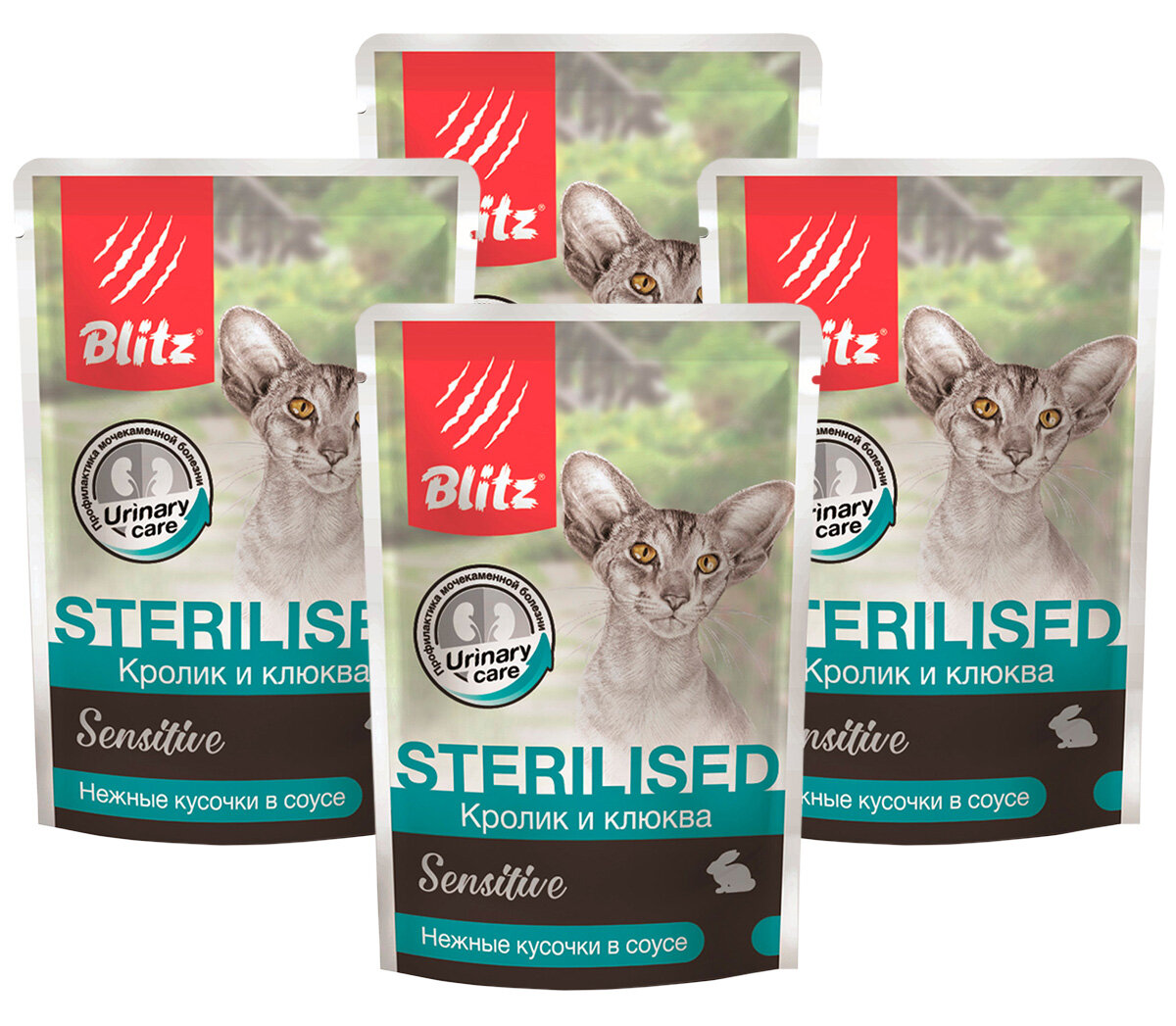 Купить BLITZ SENSITIVE для взрослых кастр котов и стерил кошек с кроликом и клюкв в соусе пауч 85 гр NEW 85 гр х 4 шт