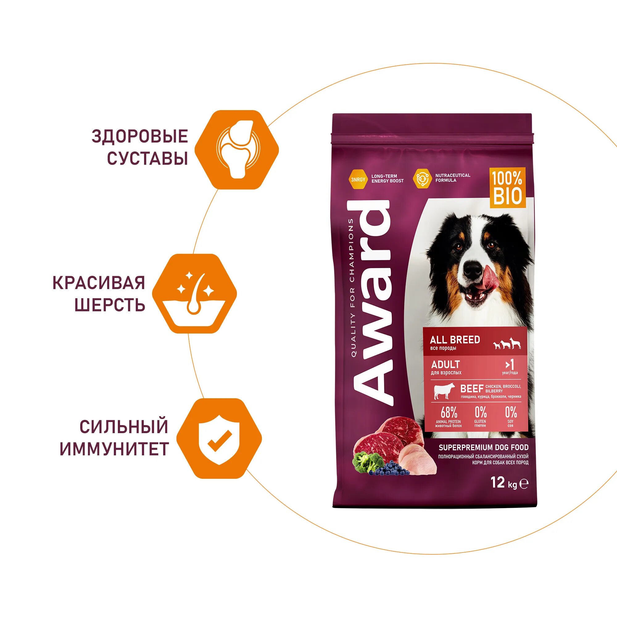 Купить Корм сухой Award для взрослых собак всех пород с говядиной и курицей с добавлением брокколи и черники 12кг