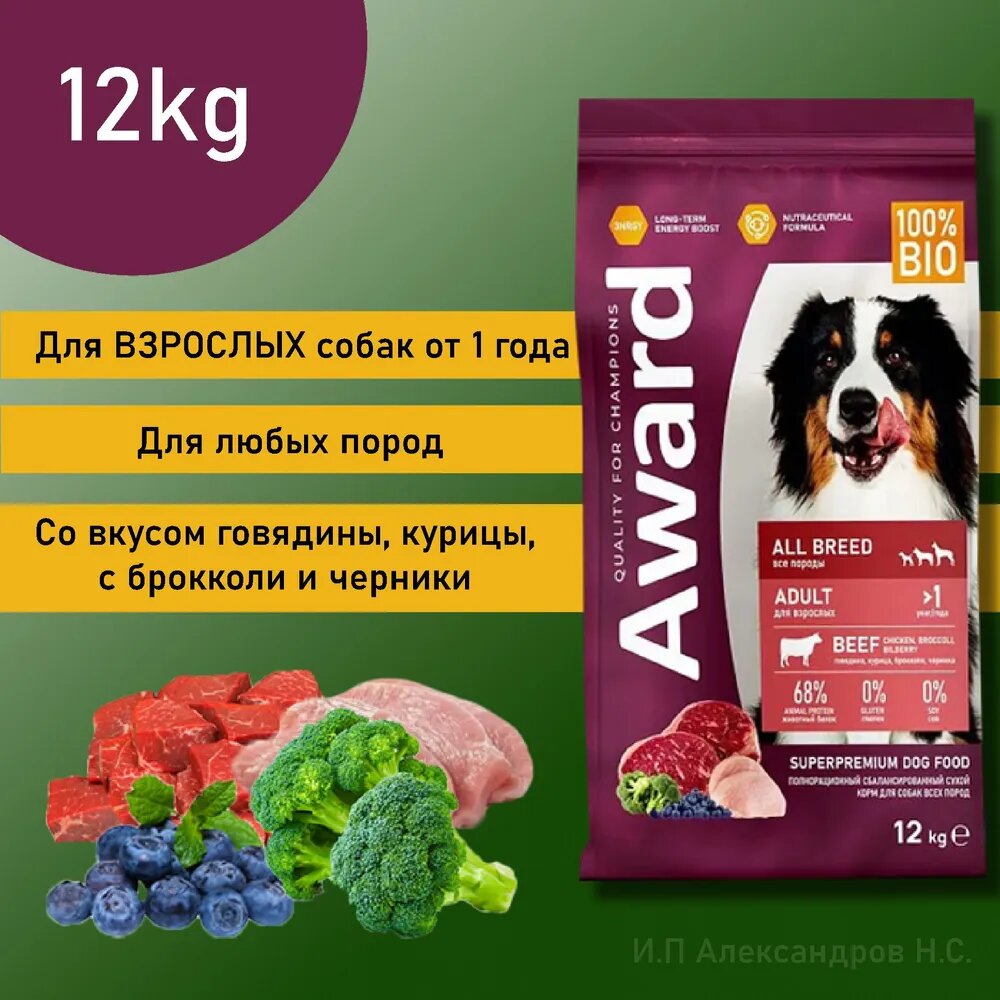 Сухой корм AWARD для взрослых собак всех пород с говядиной и курицей с добавлением брокколи и черники 12 кг