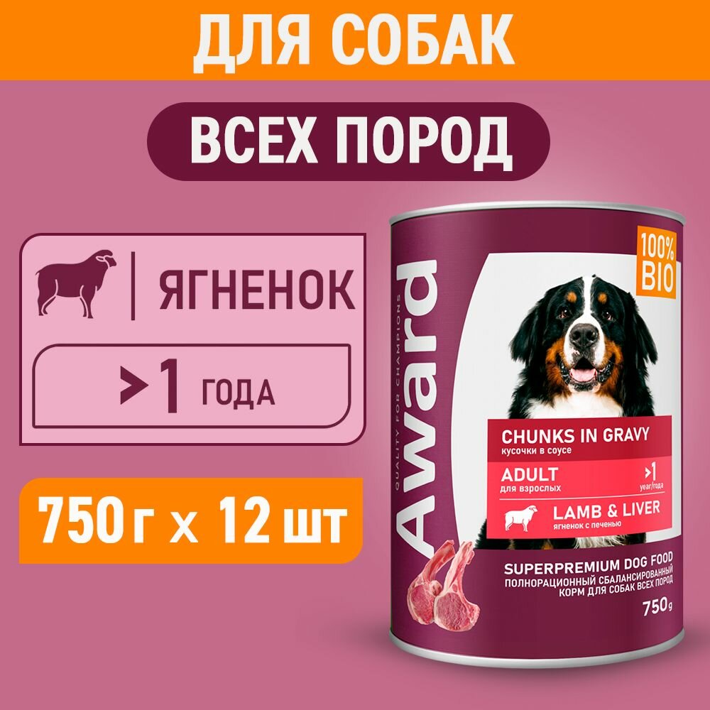 Купить AWARD влажный корм для взрослых собак, кусочки с ягненком и печенью в соусе, в консервах - 750 г х 12 шт