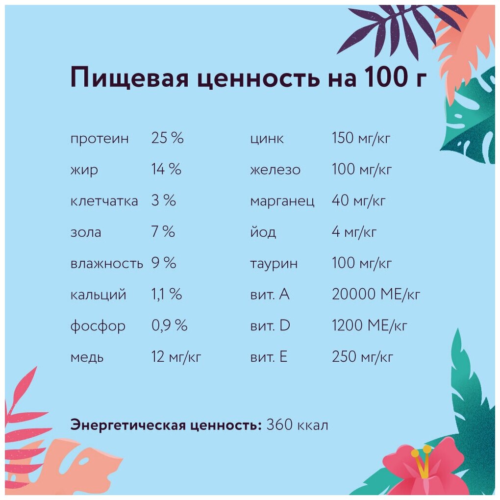 | Минеральные вещества | -цинк 150 мг/кг -железо 100 мг/кг -марганец 40 мг/кг -йод 4 мг/кг -таурин 100 мг/кг |