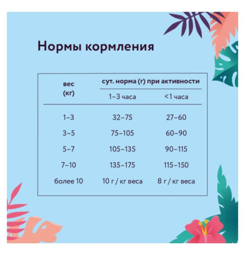 | Дозировка | Суточная норма может варьироваться в зависимости от возраста, комплекции и уровня активности вашего питомца. Не забывайте своевременно пополнять миску свежей питьевой водой. |