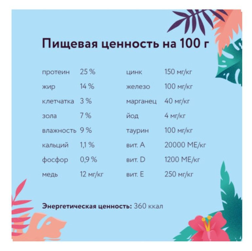 | Минеральные вещества | -цинк 150 мг/кг -железо 100 мг/кг -марганец 40 мг/кг -йод 4 мг/кг -таурин 100 мг/кг |