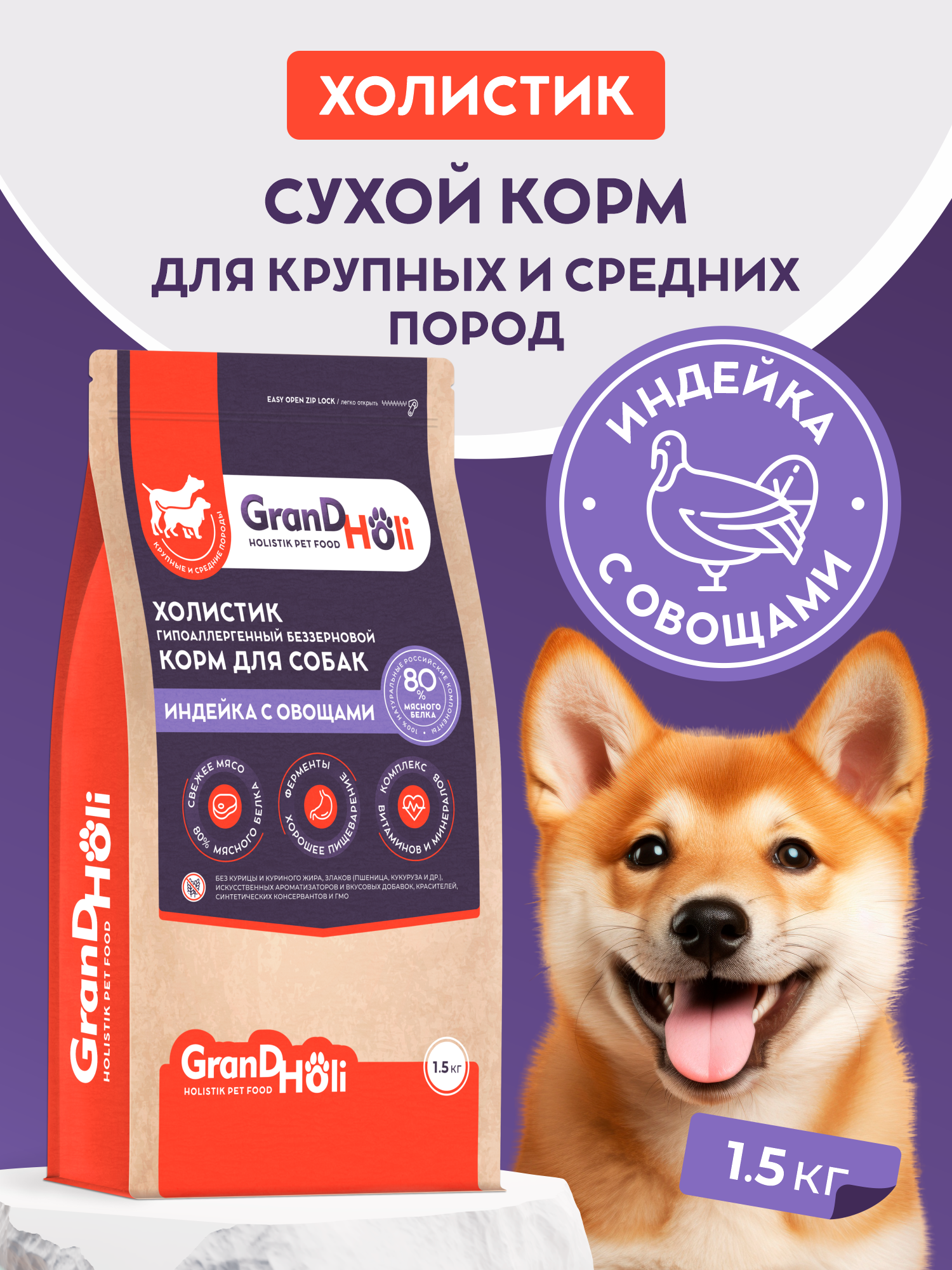 Сухой корм для собак GRANDHOLI холистик для крупных и средних пород "Индейка с овощами" 1,5 кг