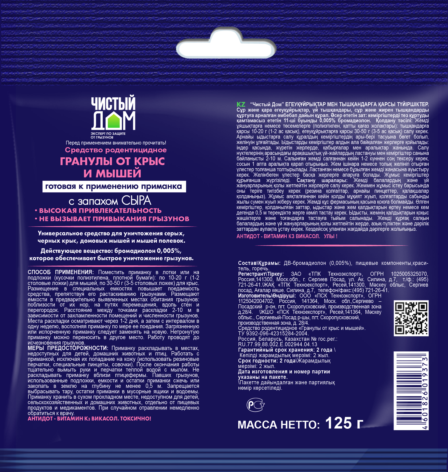 | Дополнительная информация | меры предосторожности: приманку раскладывать в местах, недоступных для детей и домашних животных; работать с приманкой, исключая ее попадание на кожу (использовать резиновые перчатки, специальные совочки, ложки); после окончания работы тщательно вымыть руки и перчатки теплой водой с мылом; павших грызунов, использованные подложки, емкости и остатки приманки сжечь или закопать в землю на глубину не менее 0,5 м; запрещается выбрасывать тару, остатки приманки в мусорные ящики и водоемы; приманку хранить в сухом прохладном месте отдельно от пищевых продуктов и медикаментов; при случайном отравлении немедленно обратиться к врачу; антидот – витамин КЗ викасол |