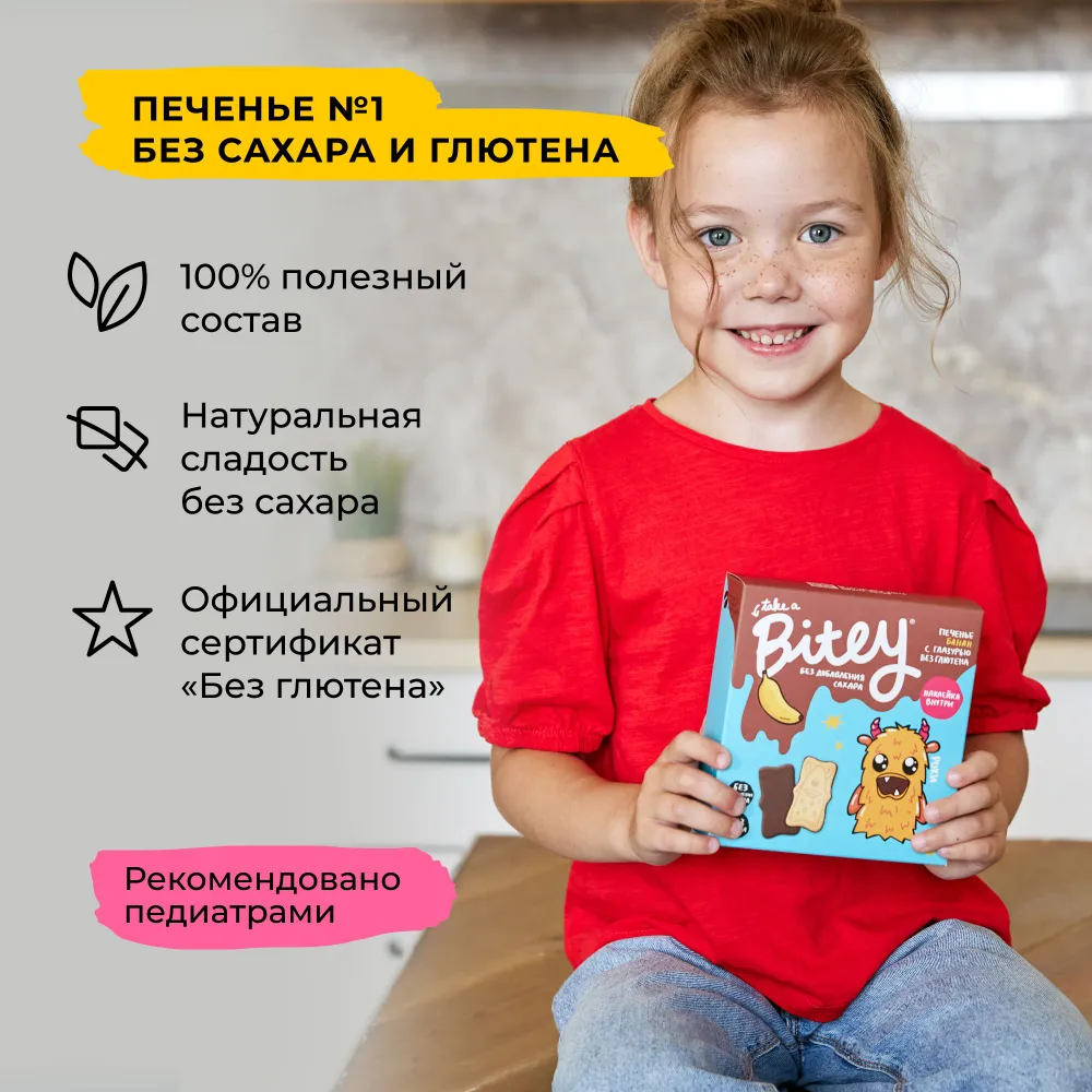 СохранитьПеченье детское без сахара шоколадное Take a Bitey / Bite, Банан, без глютена, 4 шт по 125 гр интересное: