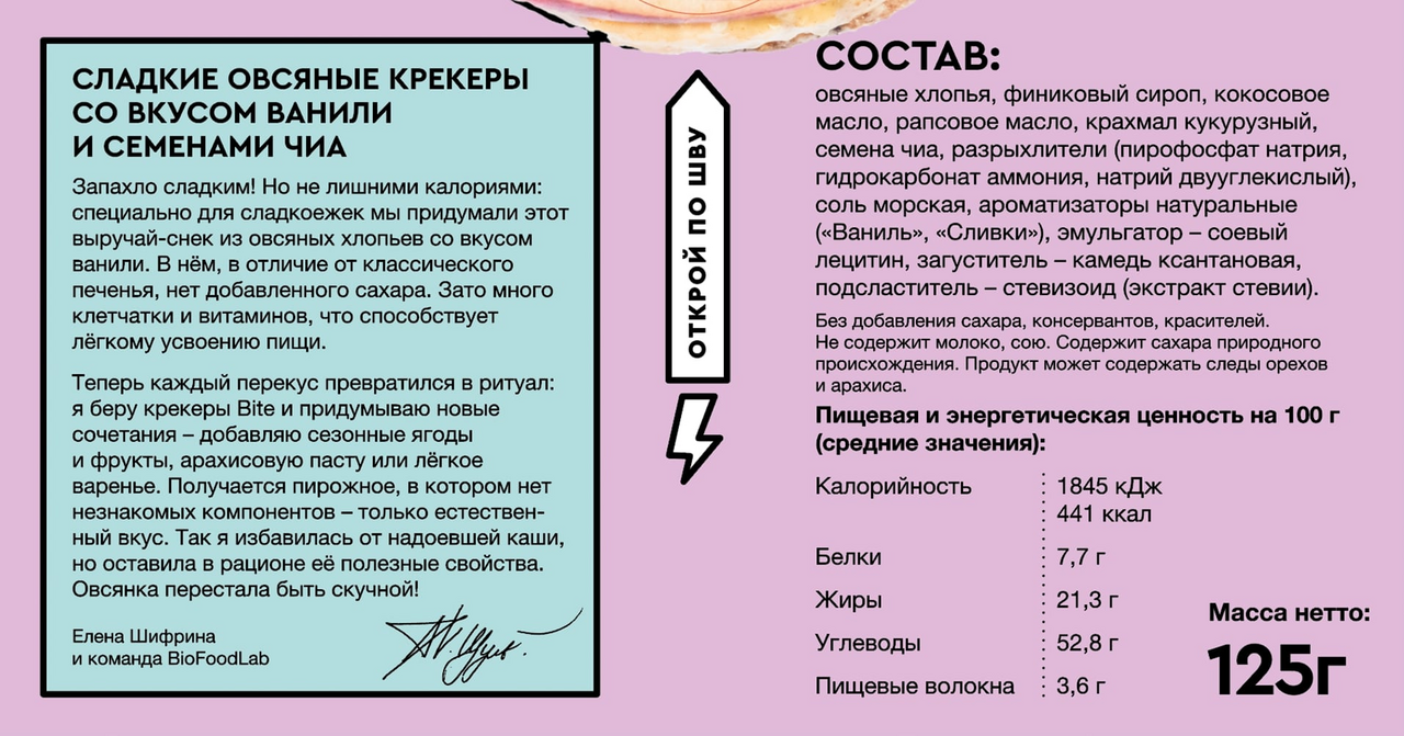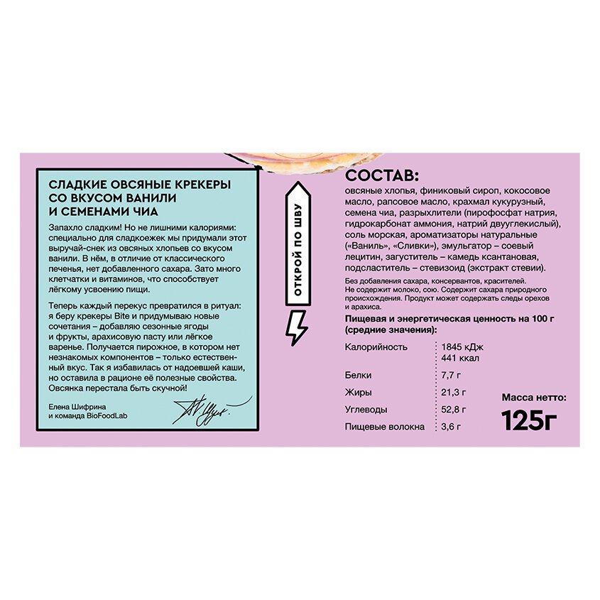 Крекеры овсяные, сладкие, со вкусом ванили и семенами чиа, 125 грамм, Bite