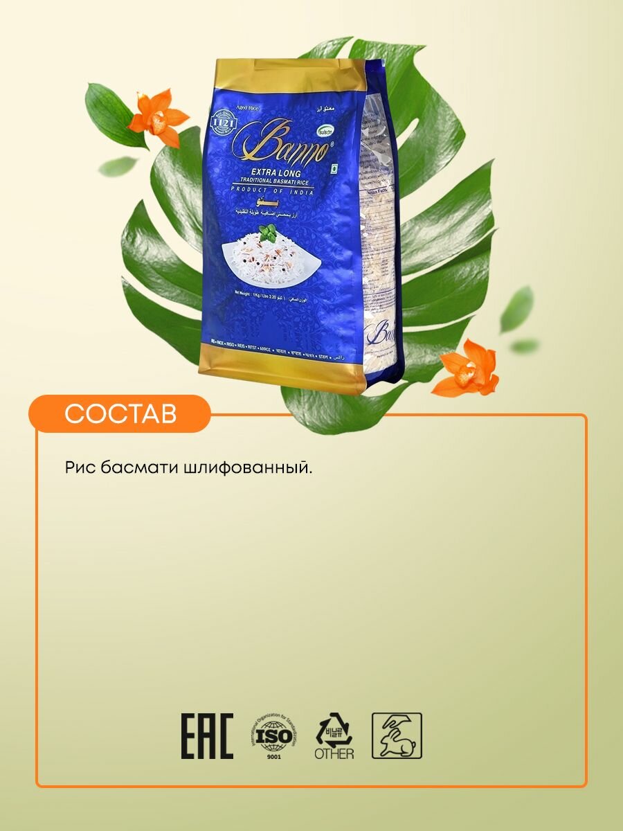 Рис басмати Экстра Лонг Традиционный Banno 1 кг индийский для плова и варки длиннозерный белый