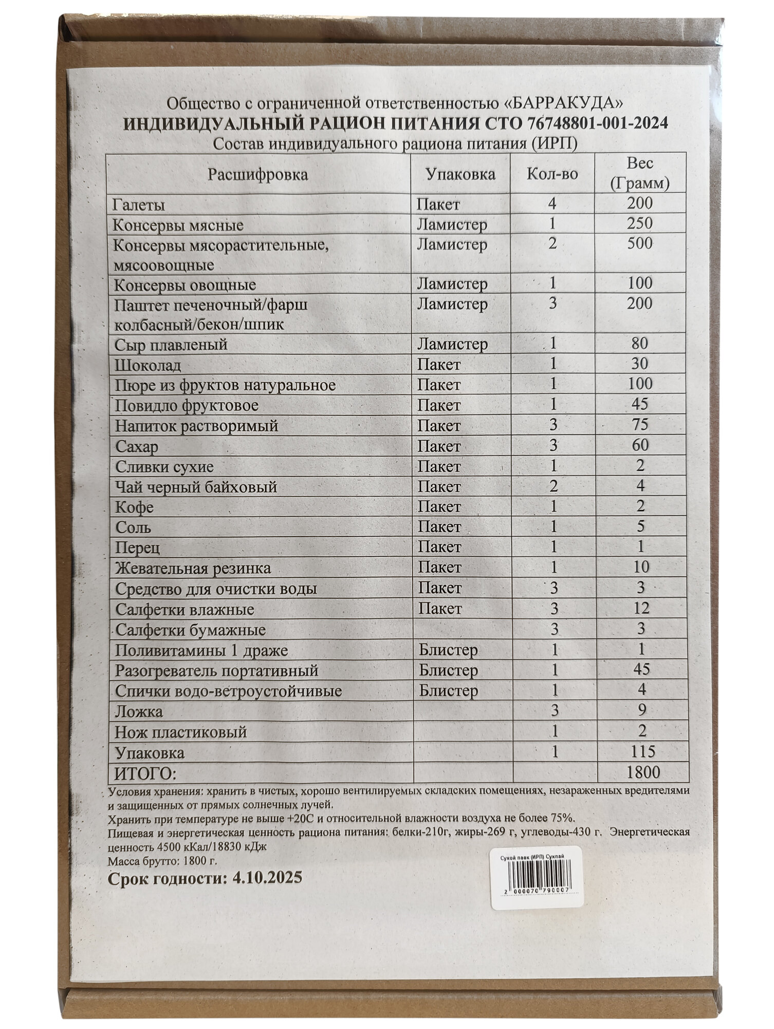 Сухой паек (сухпай) ИРП Суточный, до 04.10.2025г интересное: