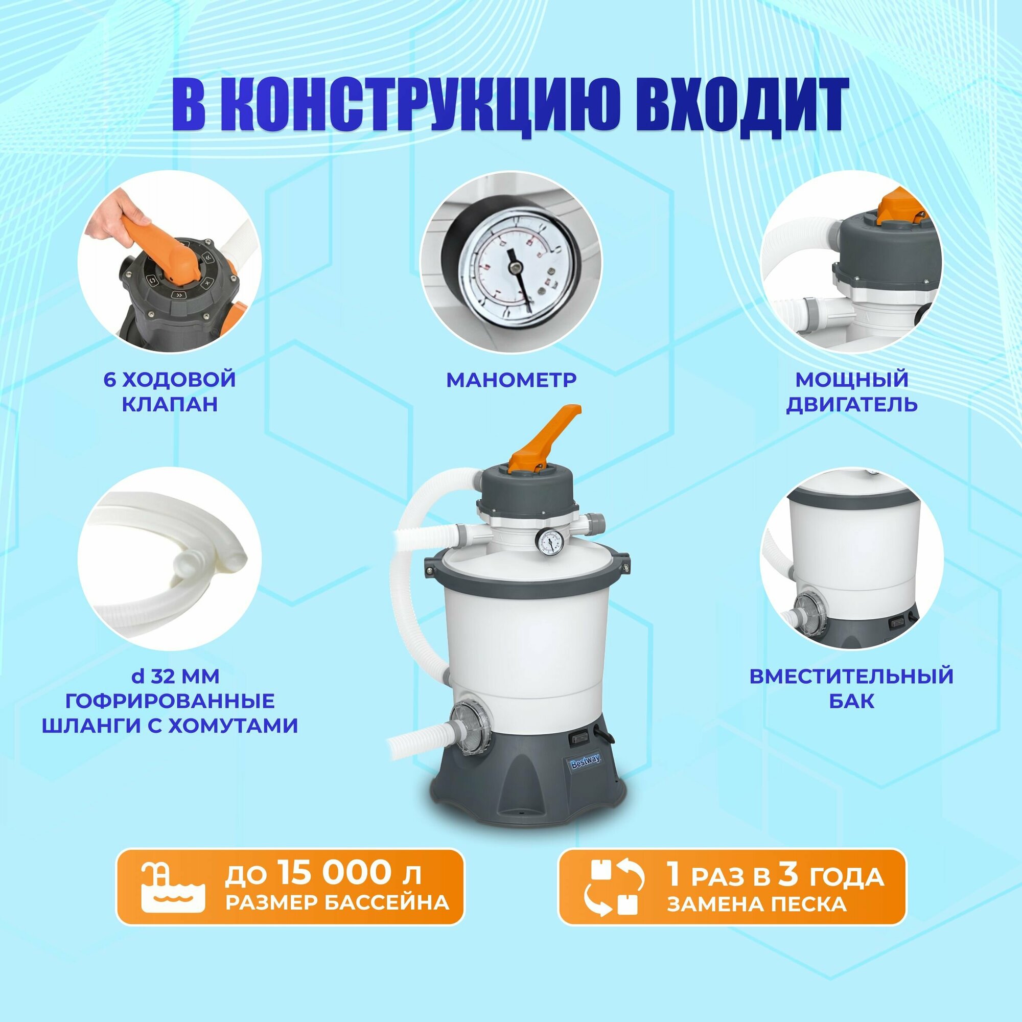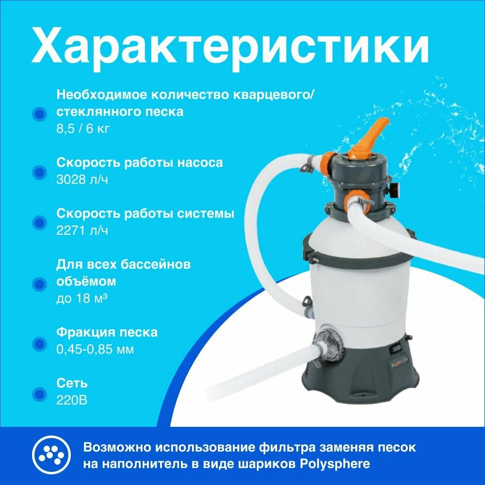 Фильтр-насос песочный 3028л/ч, резервуар для песка 8.5кг, фракция 0.45-0.85мм, 58515