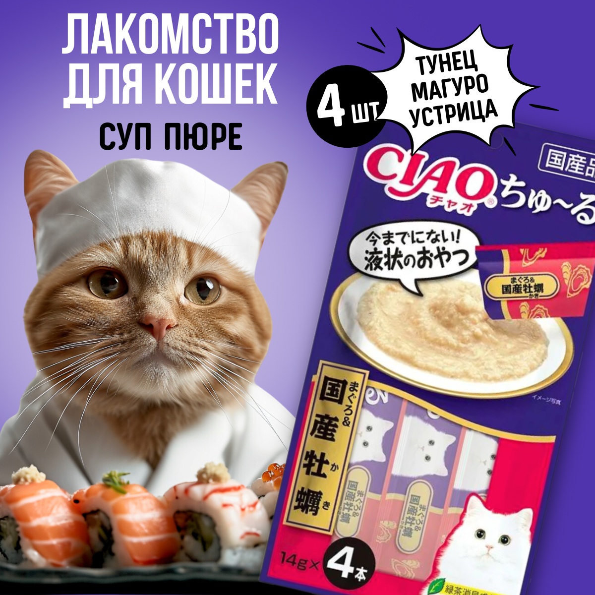 СохранитьInaba Ciao Churu Лакомство для кошек в виде пюре из Тунца Магуро и Устрицы, 4*14 г. интересное: