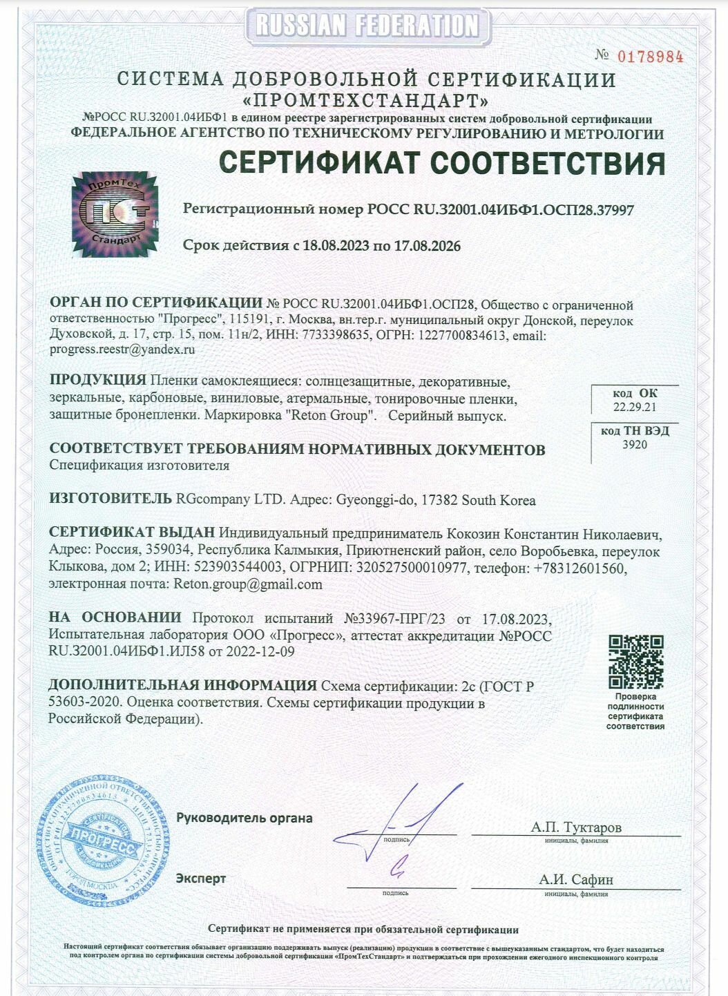 Атермальная тонировка Nano 90 Reton Group. Атермальная пленка для авто 100х152 см