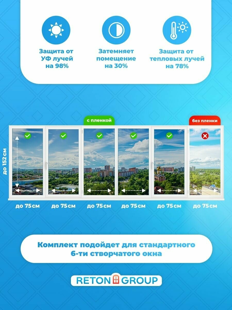 Атермальная пленка Nano 90 Reton Group. Самоклеющаяся пленка для окон 152х75 см х 3 шт. (комплект на 3 створки)