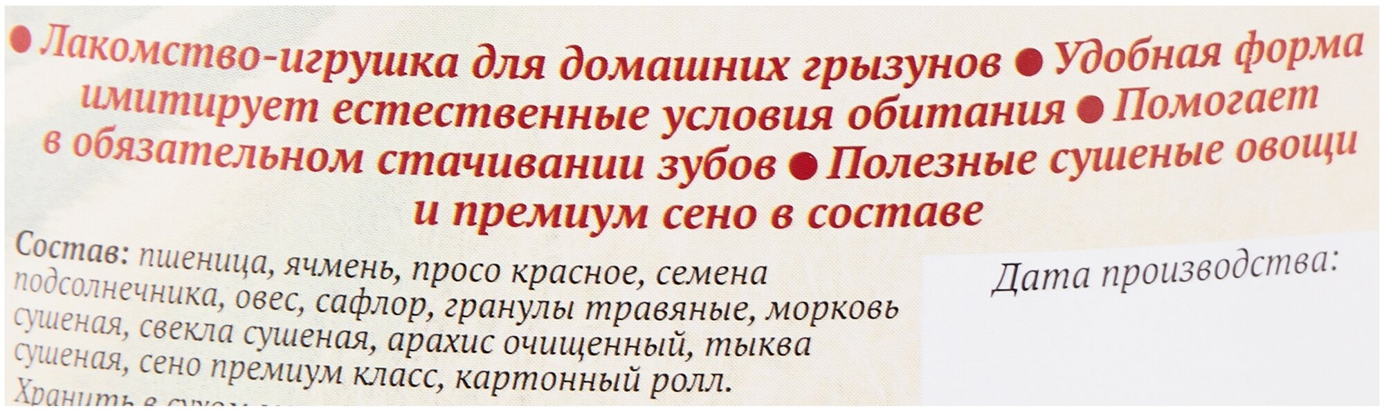 | Состав | пшеница, ячмень, просо красное, семена подсолнечника, овес, сафлор, гранулы травяные, морковь сушеная, свекла сушеная, арахис очищенный, тыква сушеная, сено премиум класс, картонный ролл |