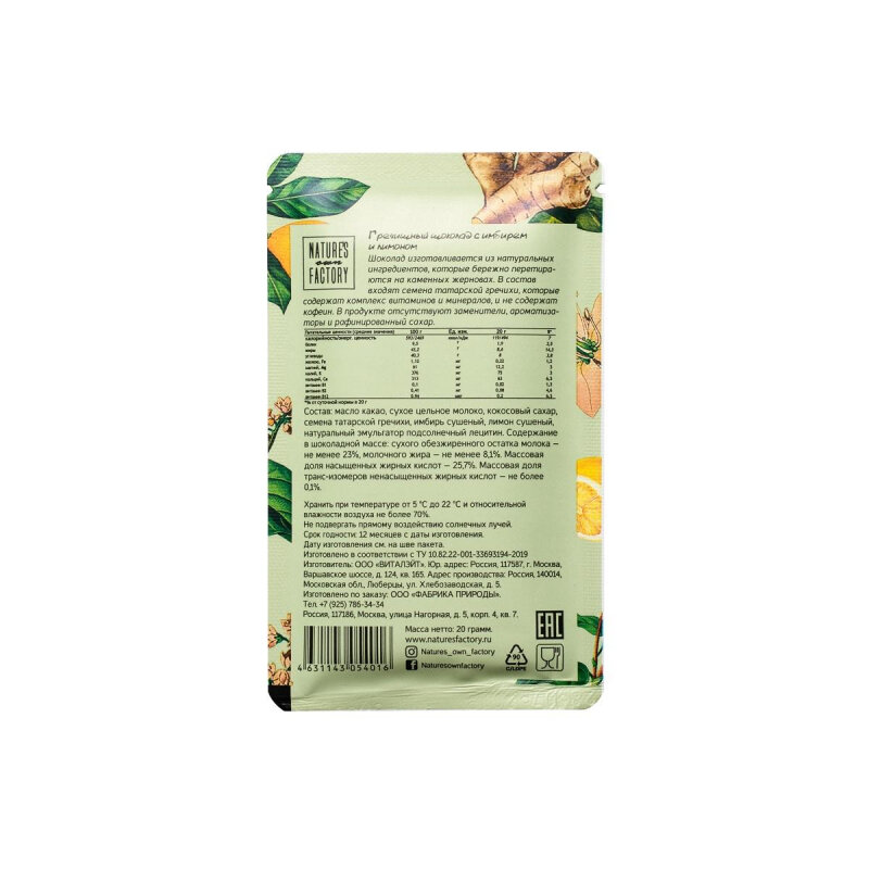 Шоколад гречишный NATURES OWN FACTORY с имбирем и лимоном, 20г