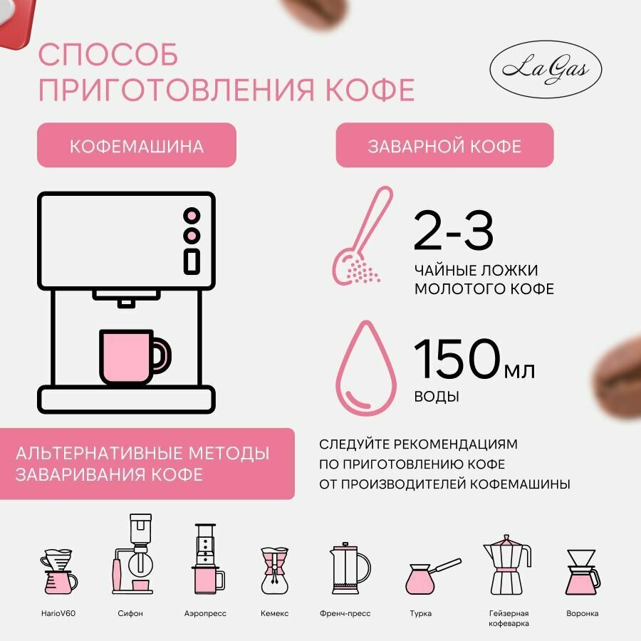 | Способ заваривания | аэропресс, гейзерная кофеварка (мока), джезва, кемекс, френч-пресс, чашка, эспрессо |