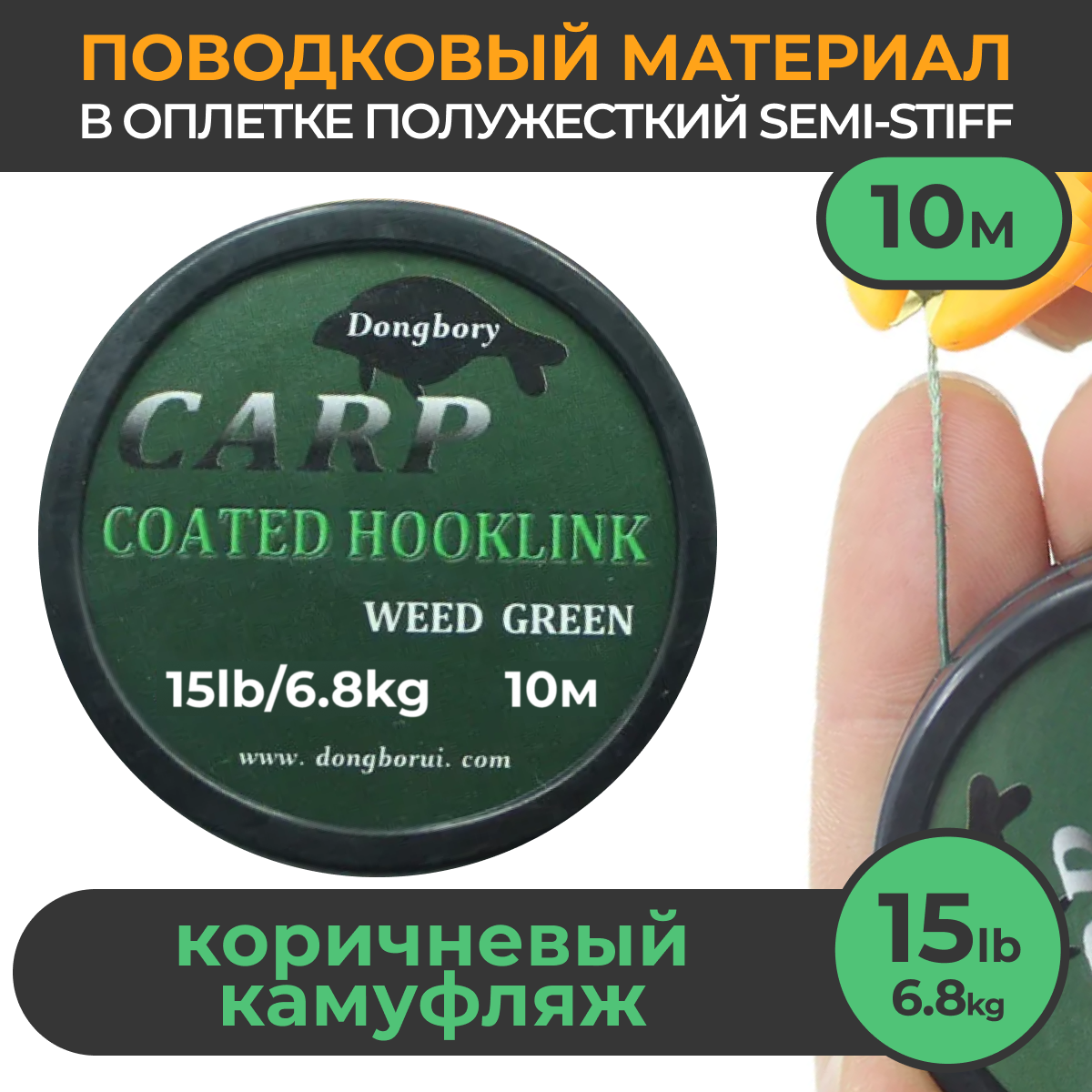 СохранитьПоводковый материал в оболочке Semi-Stiff (полужёсткий) 15LB (6.8кг), 10м Зелёный камуфляж WEEDY GREEN рыболовный / Поводок в оплётке для ловли карпа интересное:
