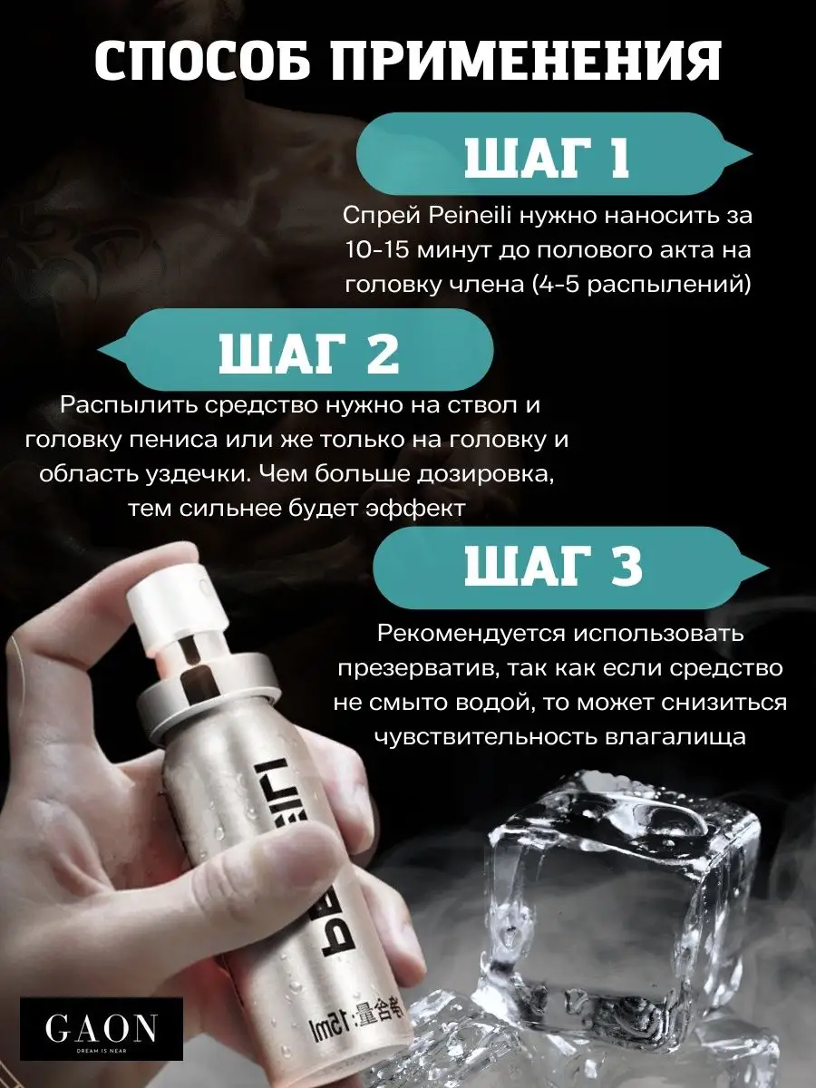 | Способ применения | 1) Спрей нужно наносить за 10-15 минут до полового акта на ствол и головку члена, либо только на головку пениса или область уздечки (3-5 распылений). Чем больше будет дозировка, тем сильнее эффект. После распыления дать впитаться и через 10-15 минут смыть водой с мылом. Действие спрея - до 40 минут. Во время секса лучше использовать презерватив, иначе может снизиться чувствительность влагалища. |