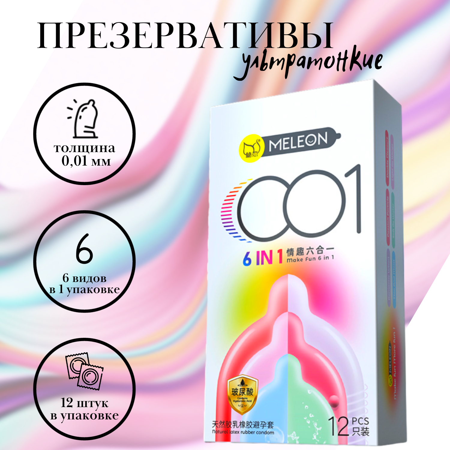 Купить Презервативы ультратонкие Meleon 0,01мм 12 штук 6 видов в упаковке