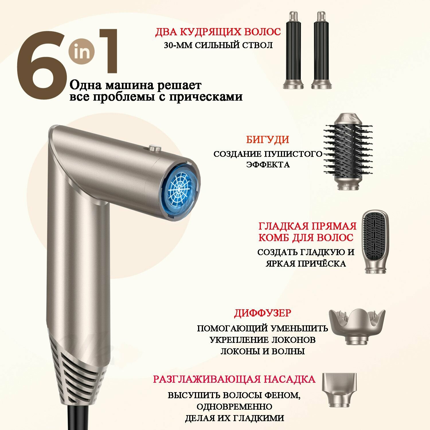 фен для волос профессиональный beutyone, плойка для локонов/стайлер для волос, с насадками для укладки расческа 6 В 1