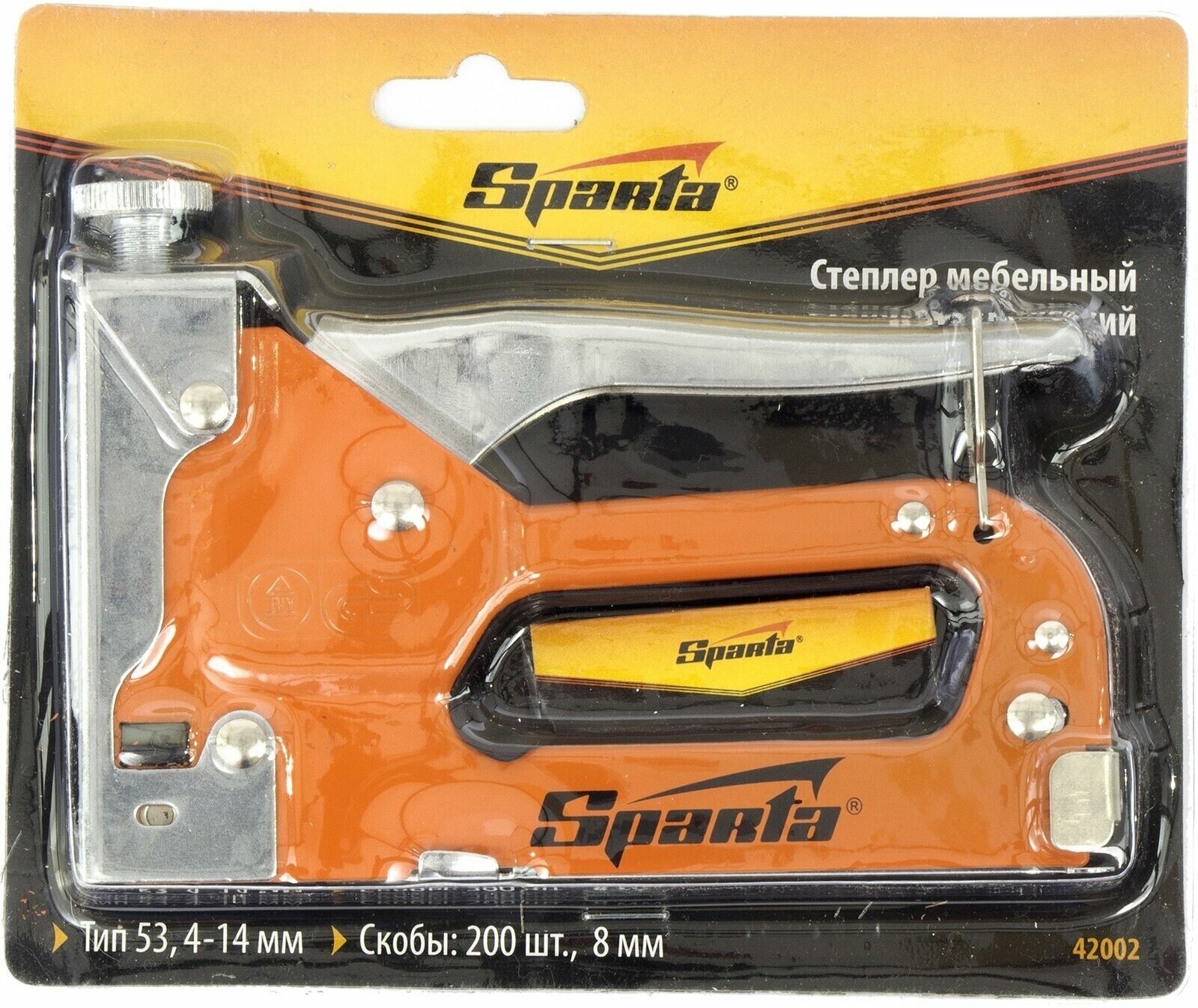 Степлер мебельный SPARTA, стальной, регулируемый, тип скобы: 53, 4-14 мм, комплект 200 скоб, 42002