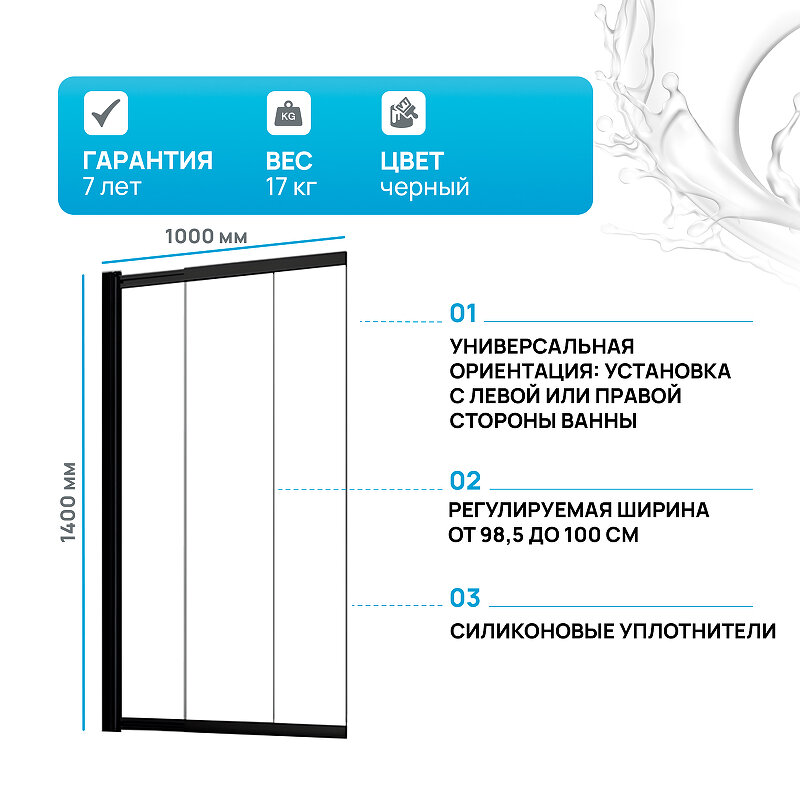 Шторка для ванны Abber Immer Offen 100x140 AG72100B профиль черный, стекло с рисунком