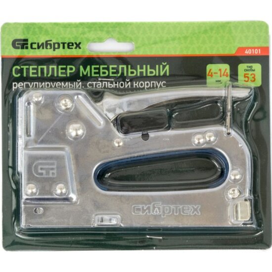 Купить Степлер мебельный СИБРТЕХ 40101, металлический, регулируемый, тип скобы 53, 4-14 мм
