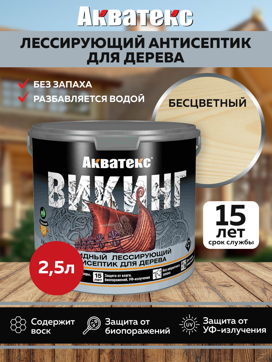 Купить Гибридный лессирующий антисептик для дерева акватекс викинг (бесцветный / 2.5л.)