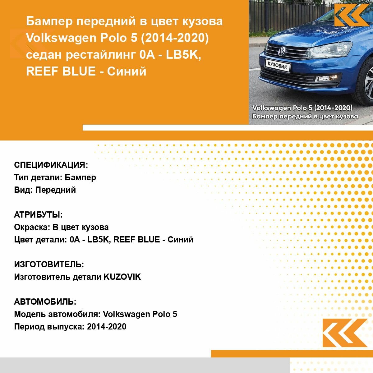 Купить Бампер передний в цвет кузова для Фольксваген Поло 5 Volkswagen Polo 5 (2014-2020) седан рестайлинг 0A- LB5K, REEF BLUE-Синий