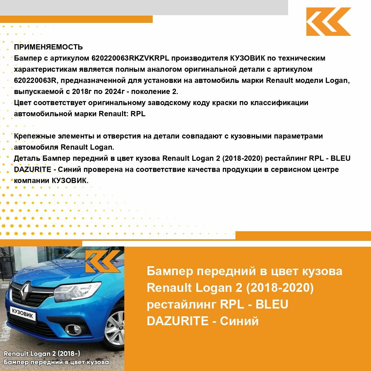 | Подробная комплектация | Бампер передний в цвет кузова для Рено Логан 2 Рено Сандеро 2 Renault Logan 2 (2018-2022) / Renault Sandero 2 (2018-2022) рестайлинг без решеток |