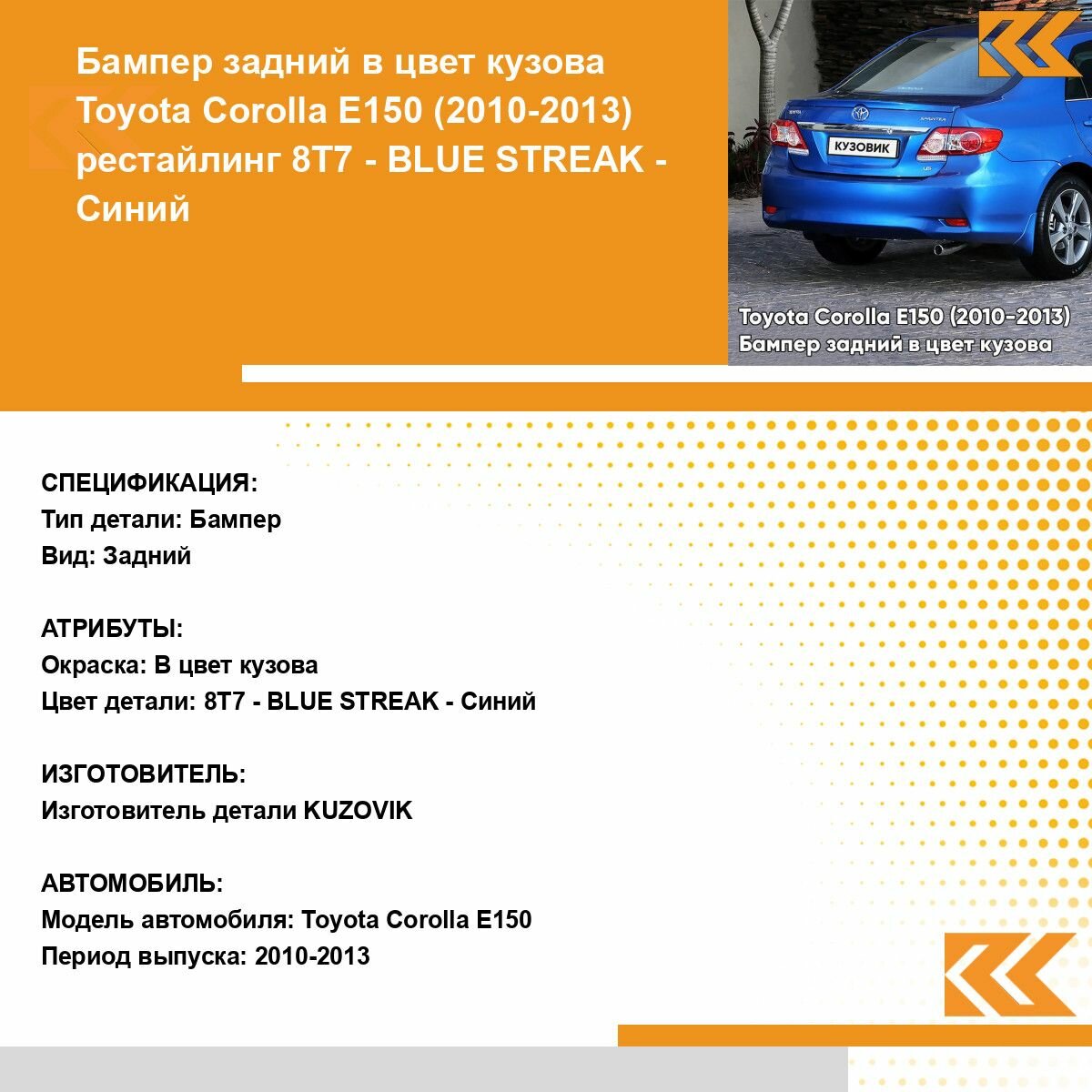| Подробная комплектация | Бампер задний в цвет кузова для Тойота Королла Е150 Toyota Corolla E150 (2010-2013) рестайлинг 8T8 - CEDAR BLUE - Голубой |
