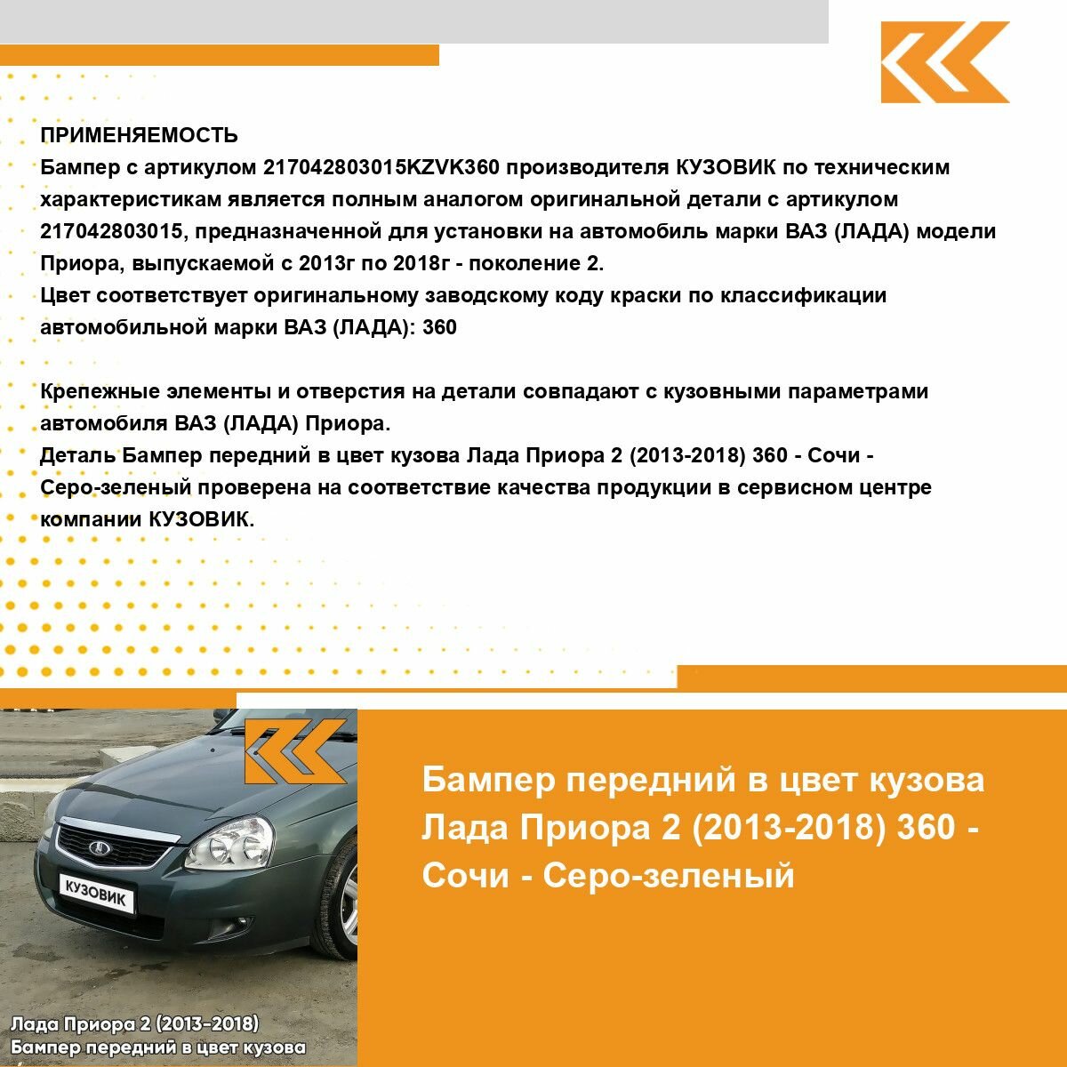 | Подробная комплектация | Бампер передний в цвет кузова для Лада Приора |