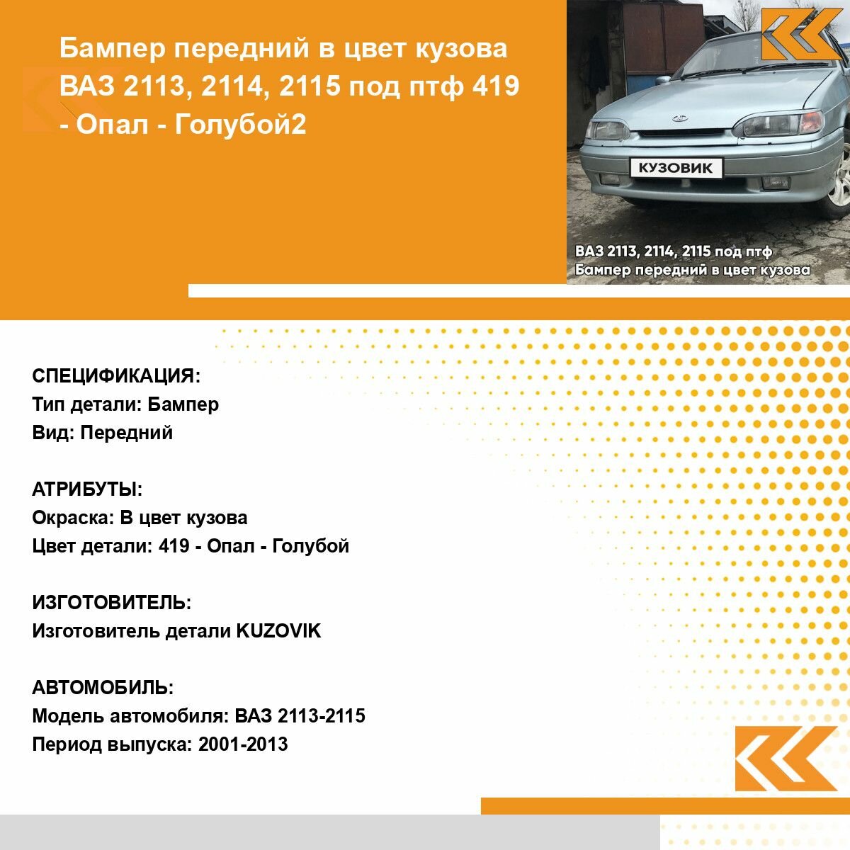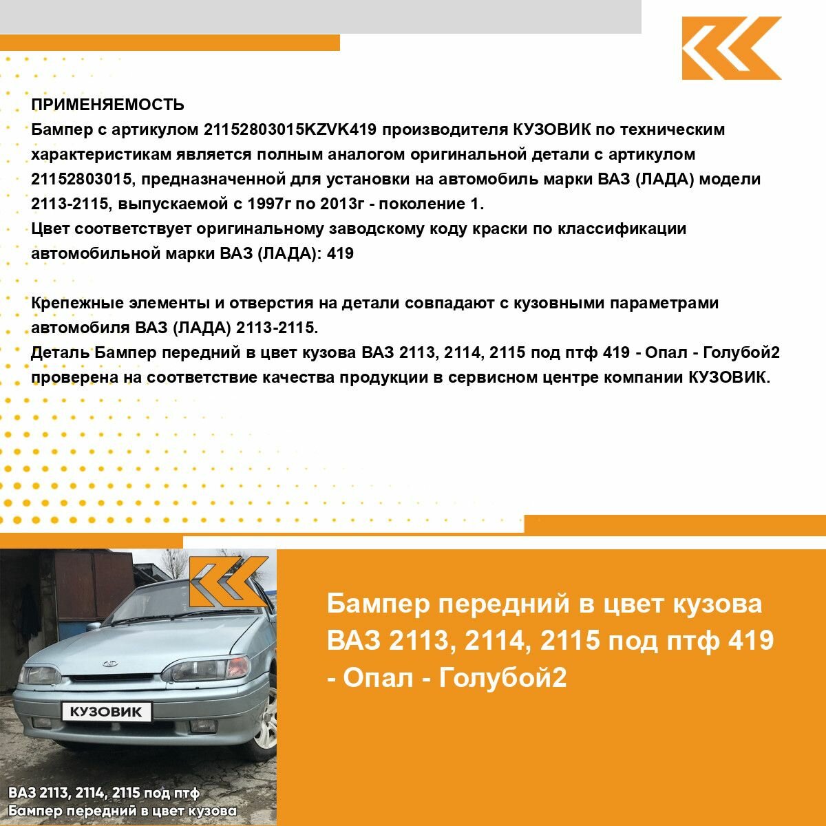 | Подробная комплектация | Бампер передний в цвет кузова ВАЗ 2114 2115 |