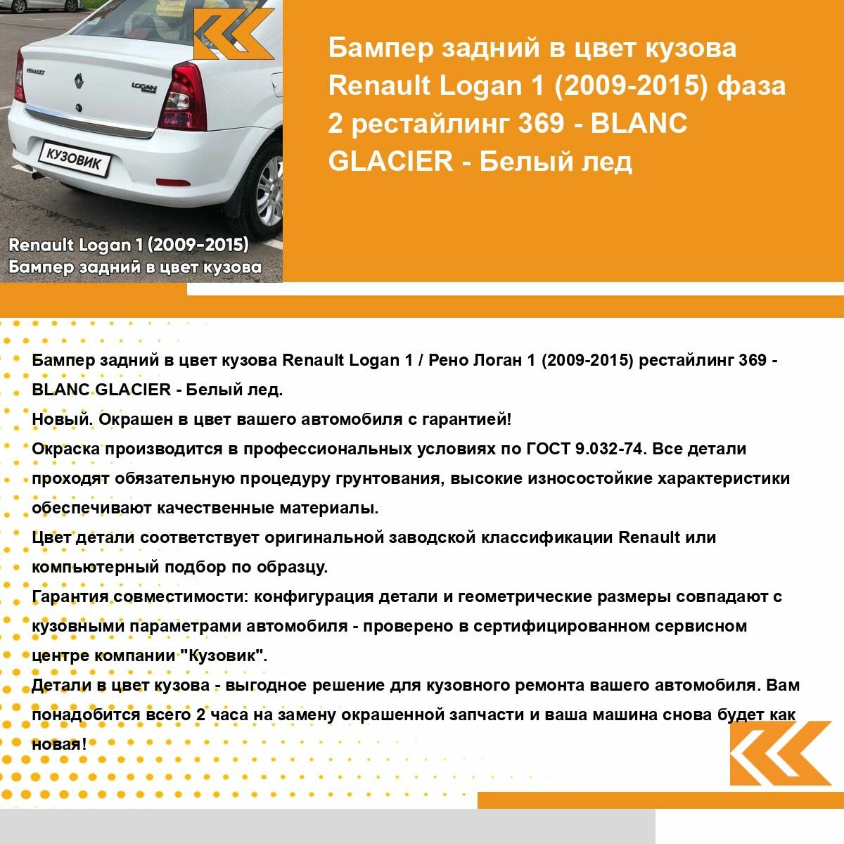 | Подробная комплектация | Бампер задний в цвет кузова для Рено Логан 1 Renault Logan 1 (2009-2015) фаза 2 рестайлинг 369 - BLANC GLACIER - Белый |