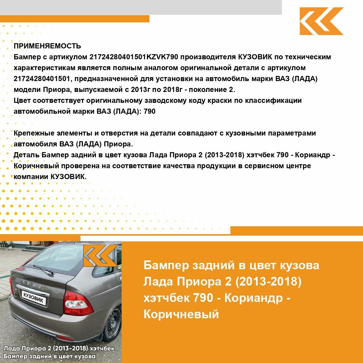 | Подробная комплектация | Бампер задний в цвет кузова для Лада Приора 2 (2013-2018) хэтчбек |