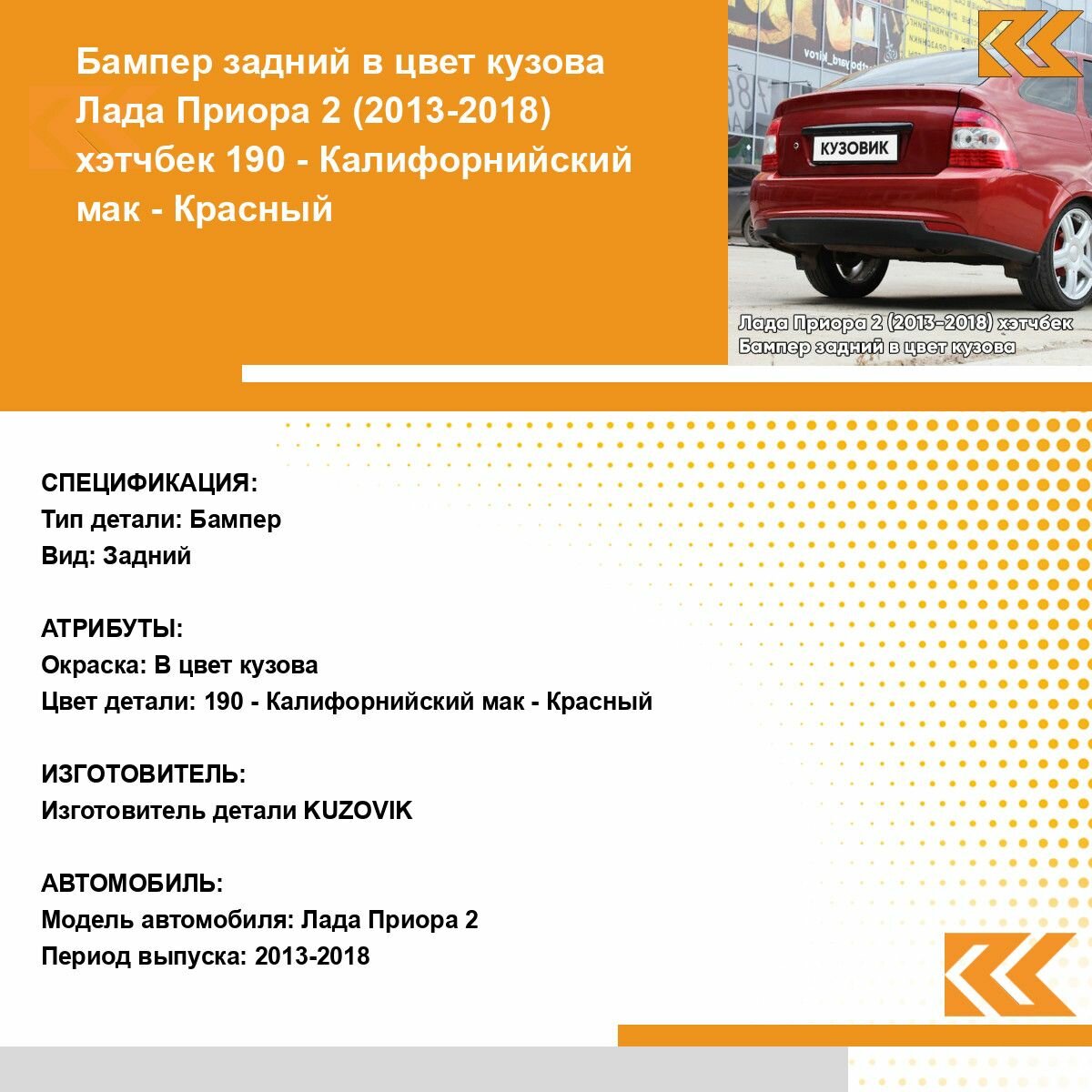 | Подробная комплектация | Бампер задний в цвет кузова для Лада Приора 2 (2013-2018) хэтчбек |