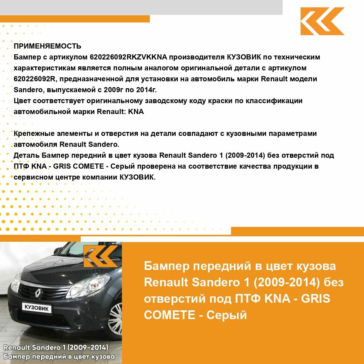 СохранитьБампер передний в цвет кузова для Рено Сандеро 1 Renault Sandero 1 (2009-2014) KNA - GRIS COMETE - Серый, без отверстий под птф интересное:
