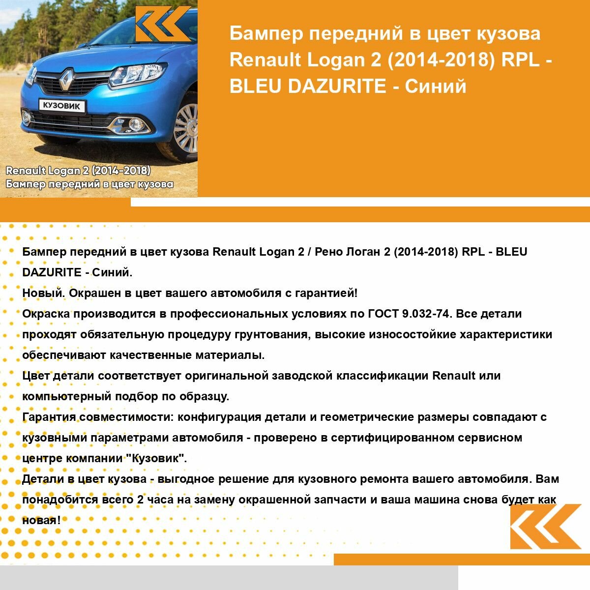 | Подробная комплектация | Бампер передний в цвет кузова для Рено Логан 2 Рено Сандеро 2 Renault Logan 2 / Renault Sandero 2 (2014-2018) |