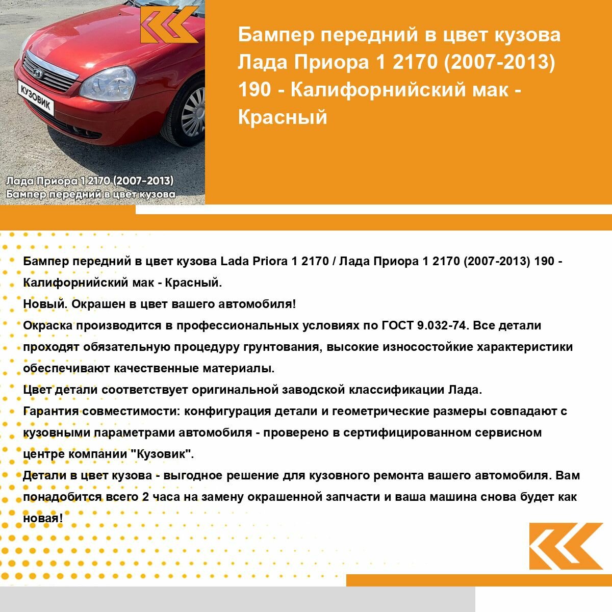 | Подробная комплектация | Бампер передний в цвет кузова для Лада Приора без решеток |