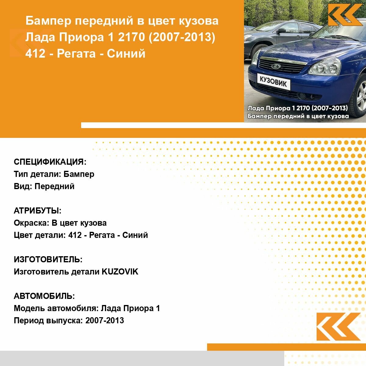 | Подробная комплектация | Бампер передний в цвет кузова для Лада Приора без решеток |