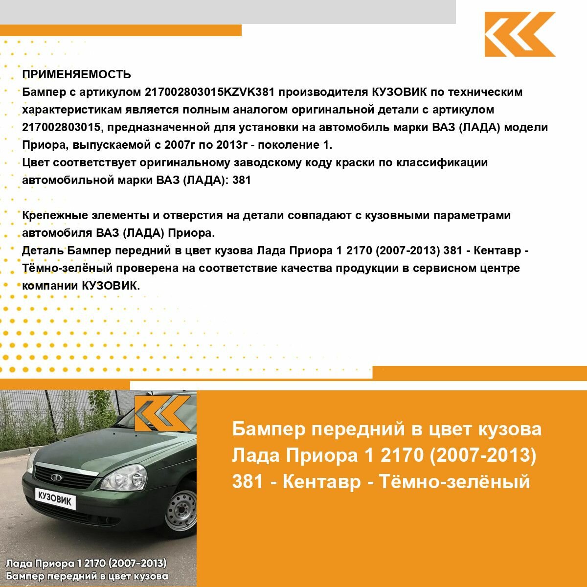 Ниже Вы можете прочитать отзывы на Бампер передний в цвет кузова для Лада Приора 1 2170 (2007-2013) 381 - Кентавр - Темно-Зеленый, ознакомится с подробными характеристиками, посмотреть интересные обзоры и фотографии на Бампер передний в цвет кузова для Лада Приора 1 2170 (2007-2013) 381 - Кентавр - Темно-Зеленый.