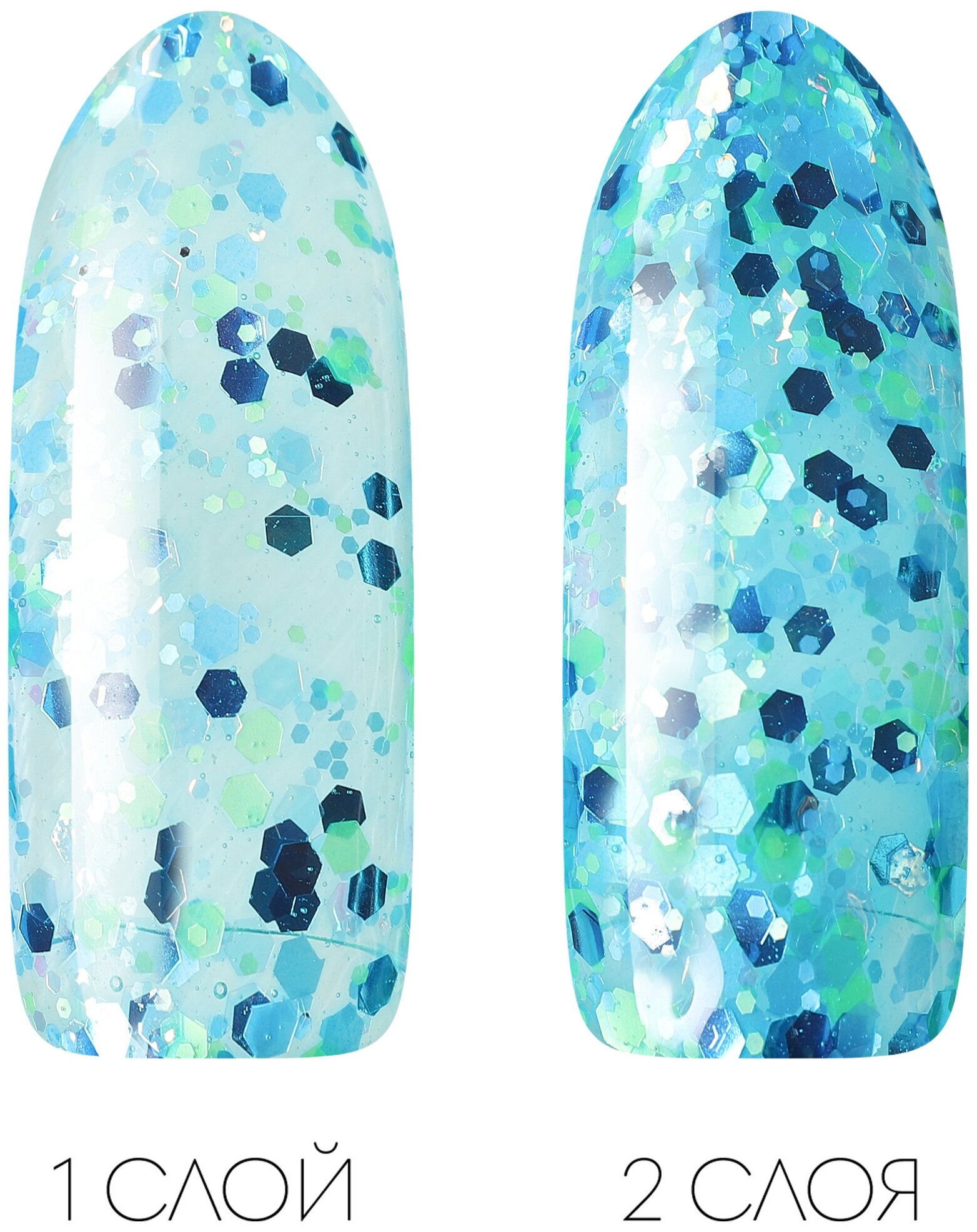 Купить Vogue Nails, Гель-лак с блестками №088 (на прозрачной бирюзовой подложке, с голубыми, зелеными и голографическими блестками разной велич
