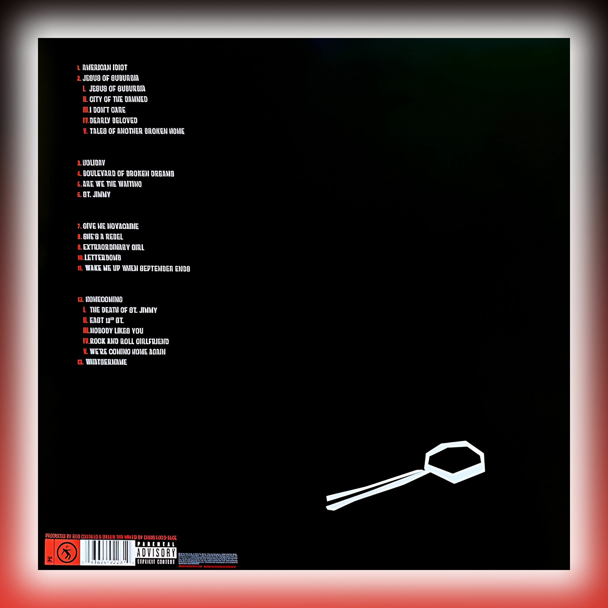 | Треклист | A1 American Idiot 2:54 B1.I Jesus Of Suburbia B1.II City Of The Damned B1.III I Don't Care B1.IV Dearly Beloved B1.V Tales Of Another Broken Home 9:08 C1 Holiday 3:52 C2 Boulevard Of Broken Dreams 4:20 C3 Are We The Waiting 2:42 C4 St. Jimmy 2:55 C5 Give Me Novacaine 3:25 C6 She's A Rebel 2:00 C7 Extraordinary Girl 3:33 C8 Letterbomb 4:06 C9 Wake Me Up When September Ends 4:45 D1.I I The Death Of St. Jimmy D1.II East 12th St. D1.III Nobody Likes You D1.IV Rock And Roll Girlfriend D1.V We're Coming Home Again 9:18 D2 Whatsername 4:12 |