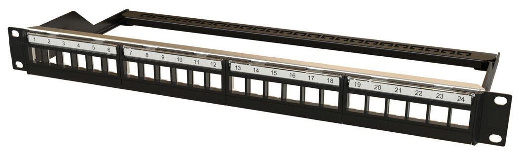 Комм. патч-панель Hyperline, 19", 1HU, портов: 24 х keystone, неэкр., цвет: чёрный, (ppbl6-19-24-rm)