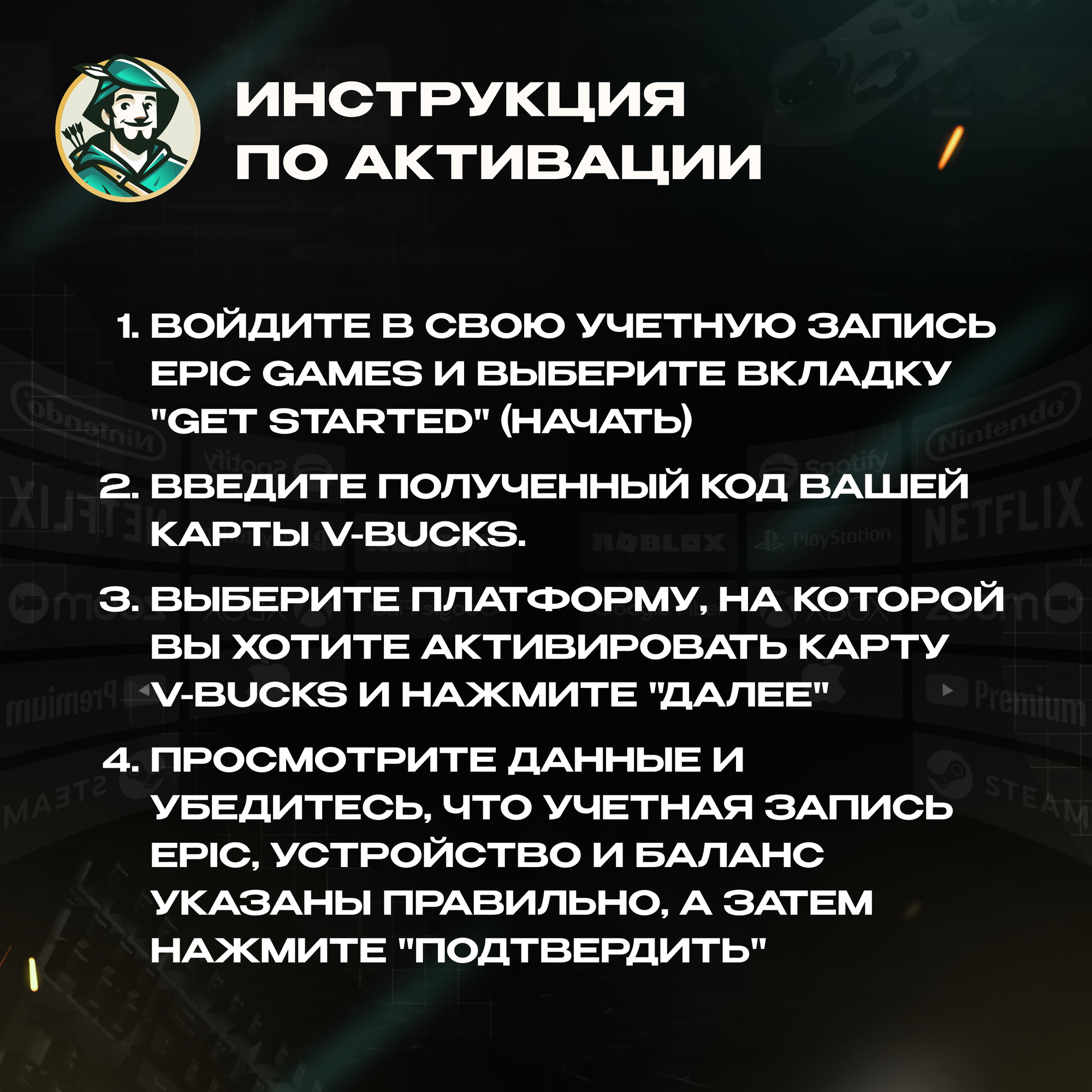 | Инструкция по активации | Чтобы обменять В-баксы, введите код на Fortnite/vbuckscard. Для использования кода V-Bucks требуется учетная запись Epic Games. После ввода кода на Fortnite/vbuckscard выберите платформу, на которой вы хотите использовать В-баксы. |